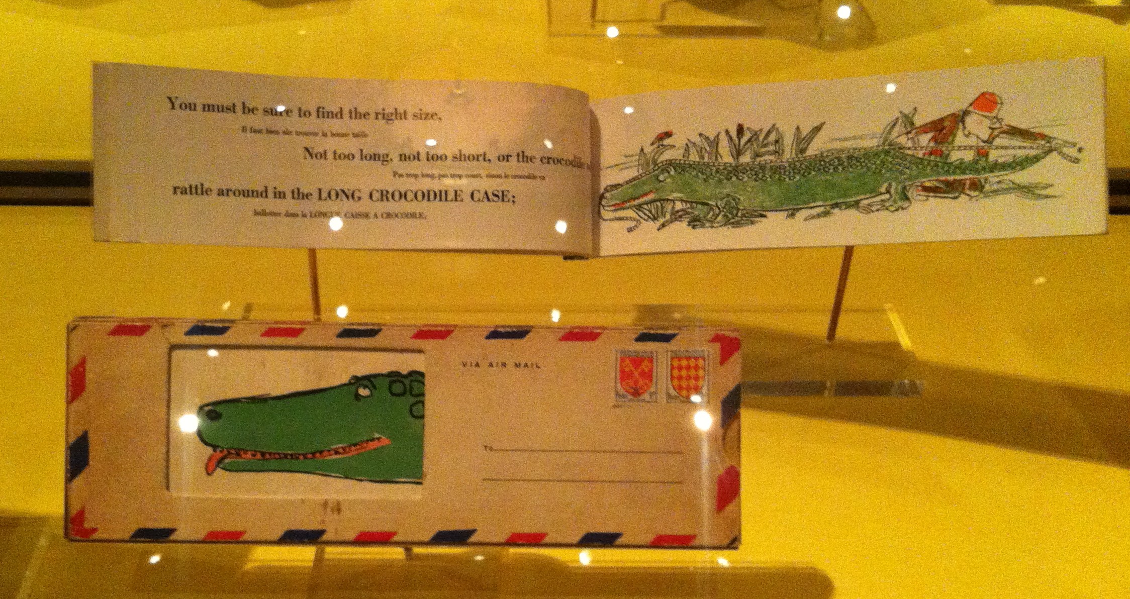 Some of my favourite exhibits were André Francois’ “Crocodile Tears” with the original slip cover, and some beautiful late nineteenth century Japanese books of fairy tales made for the foreign trade, woodblock printed on crepe paper. With lots of beautiful original artwork, and amazing spaces bringing to life scenes from “Goodnight Moon ” and “Where the Wild Things Are” it was a fascinating afternoon. And it was lovely to meet Pooh.