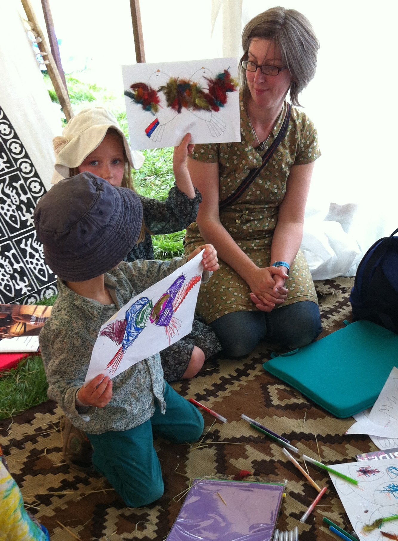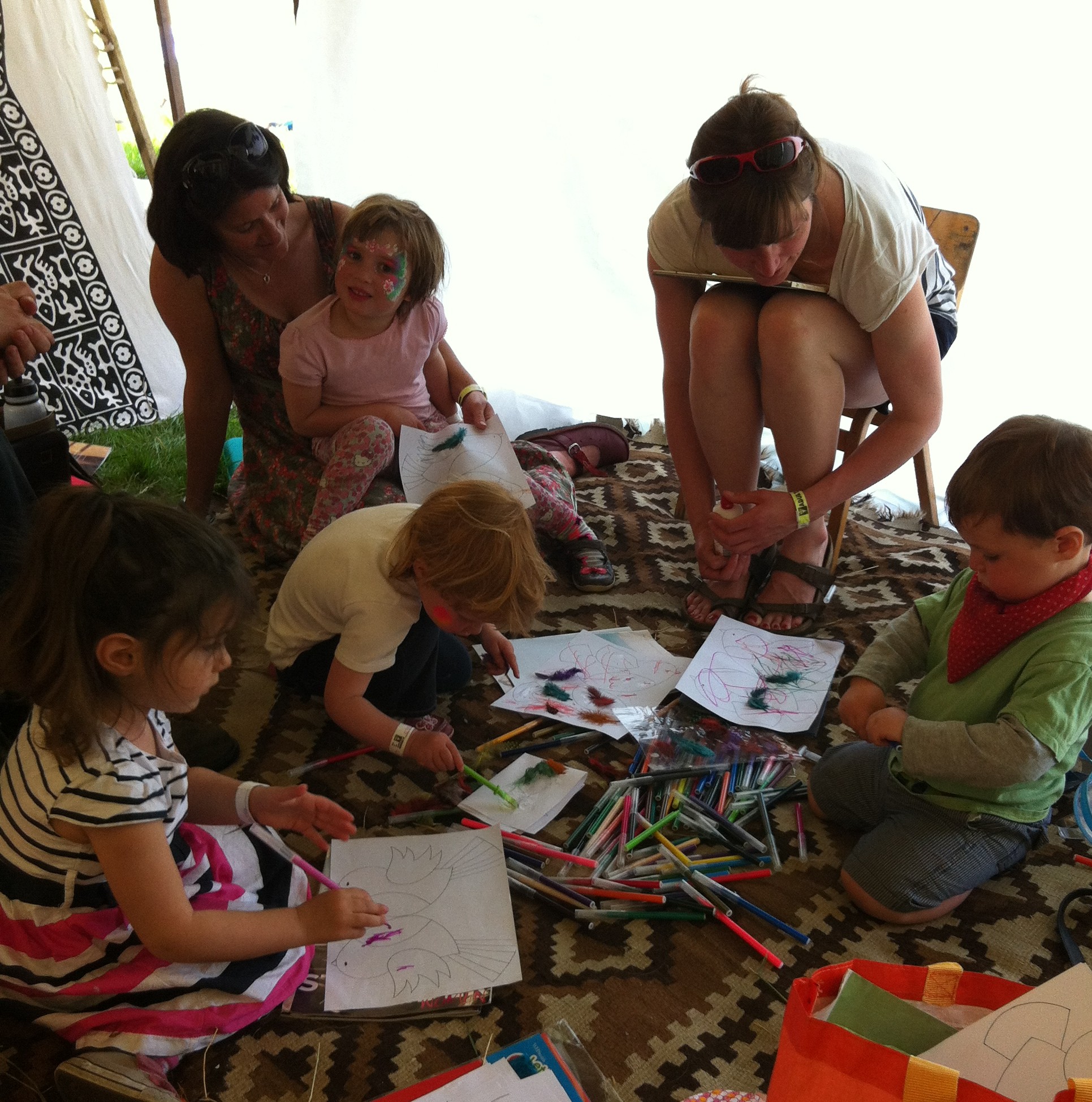 I had a great time reading The Dawn Chorus to children at Wood Festival. Even the very little ones coloured in birds and decorated them with feathers. There was a lot of careful cutting out too. My friend Shirin did a workshop making faces which produced some amazing works of art. It’s a lovely festival for younger children, lots of bubbles, singing and musical organic carrots.